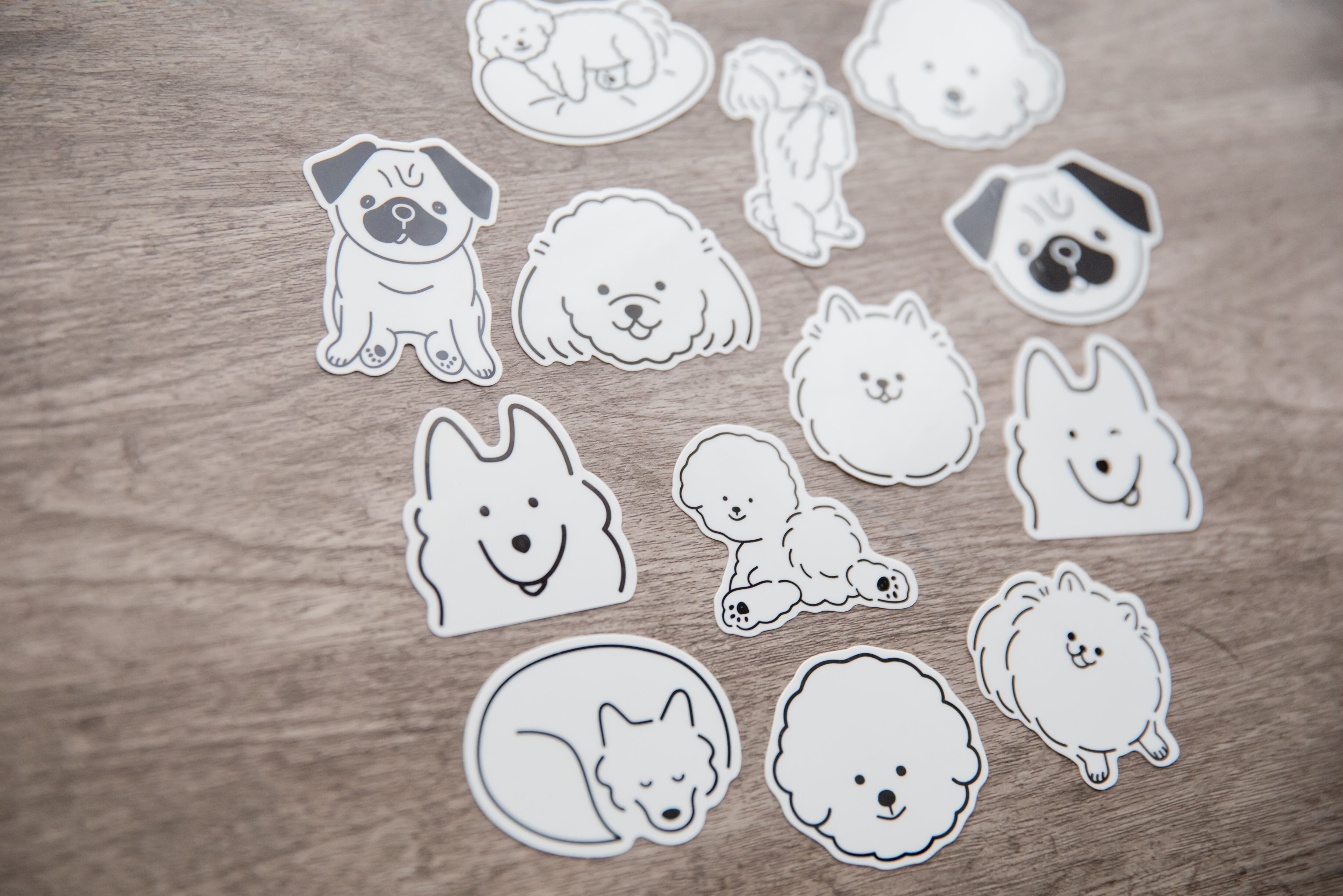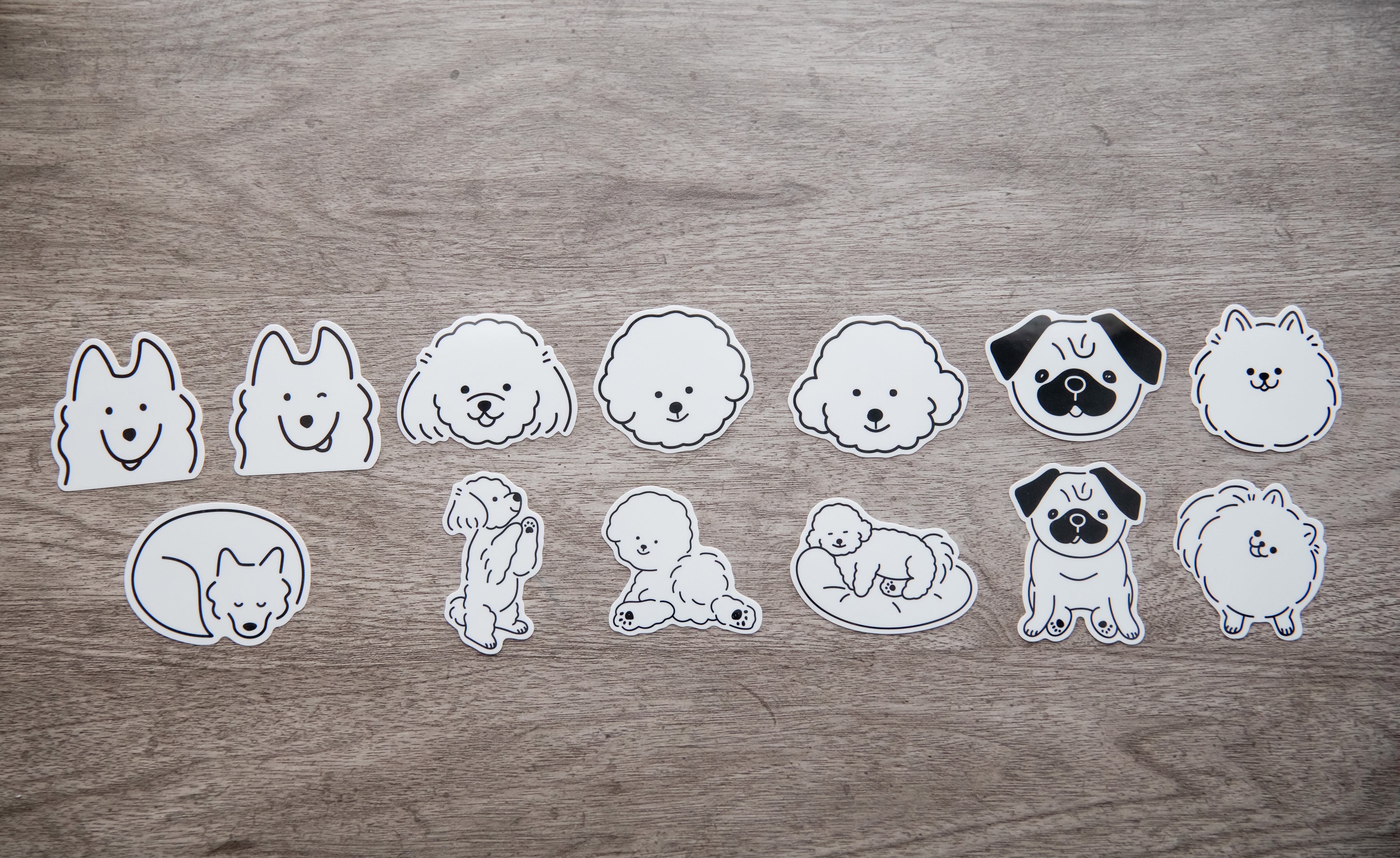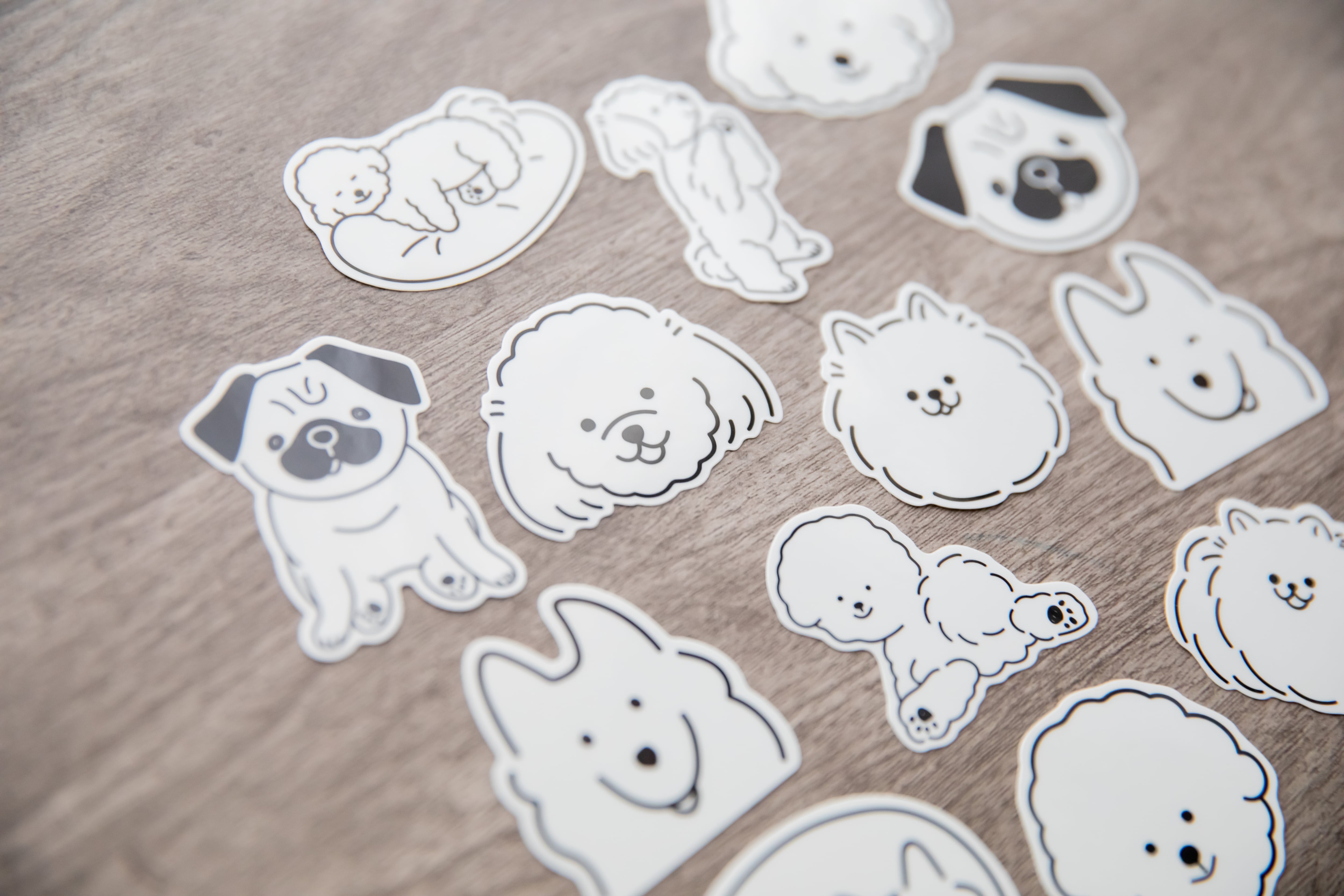 白と黒で描かれた、シンプルでおしゃれなわんちゃんたち。