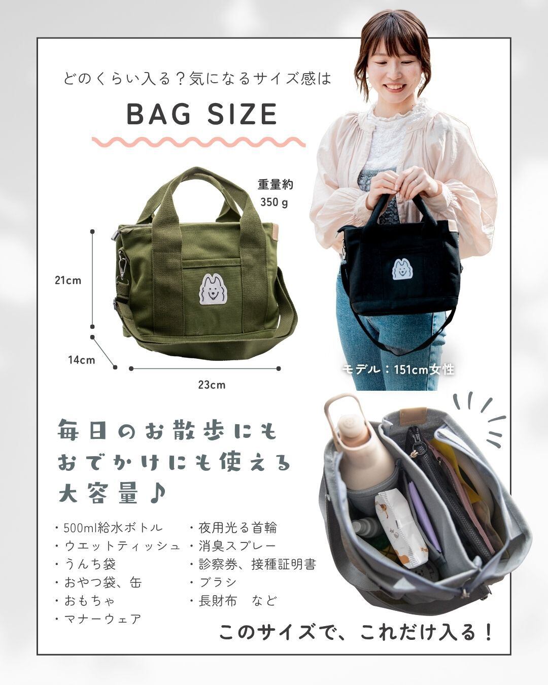 ちょっとしたお出かけやお散歩にぴったりの大容量と