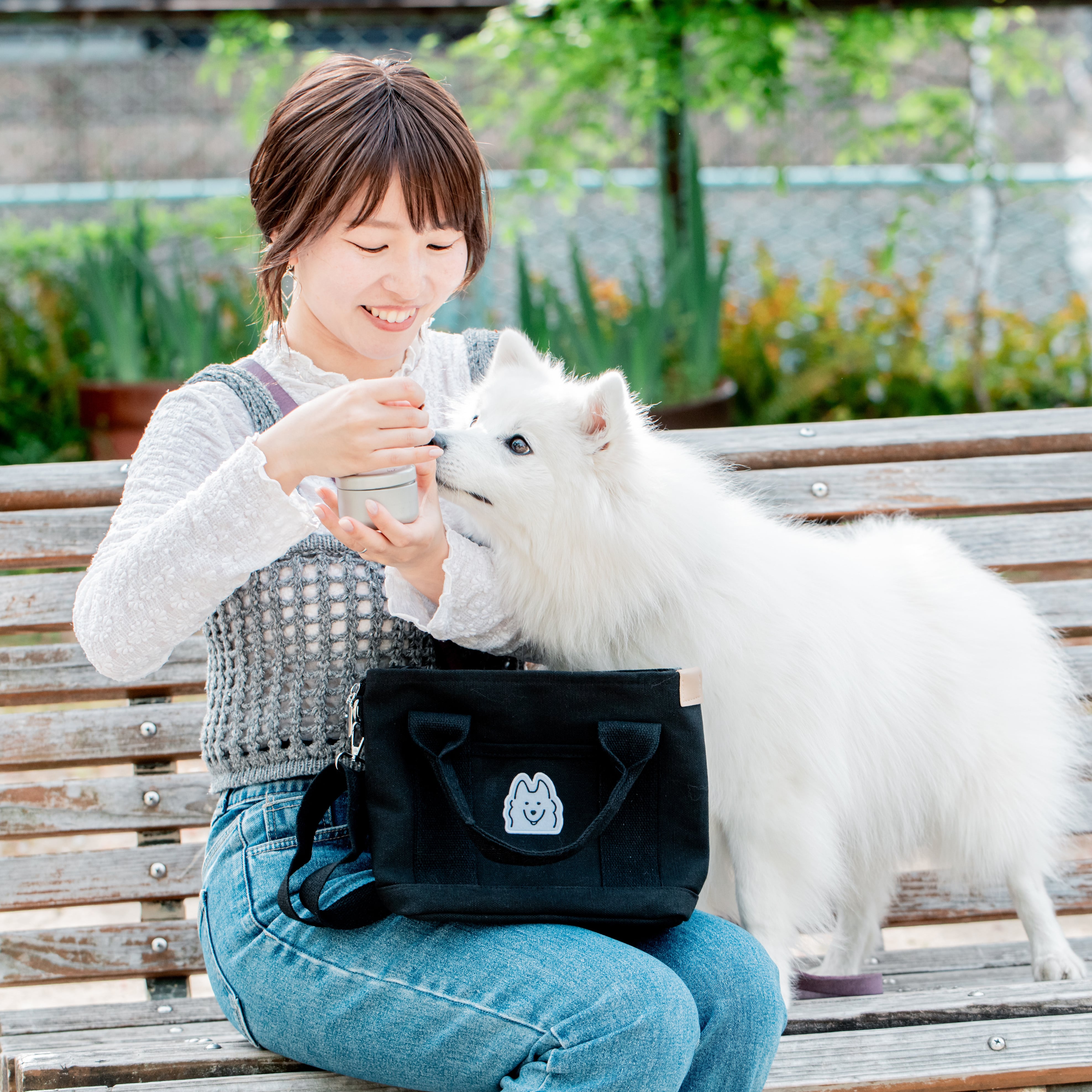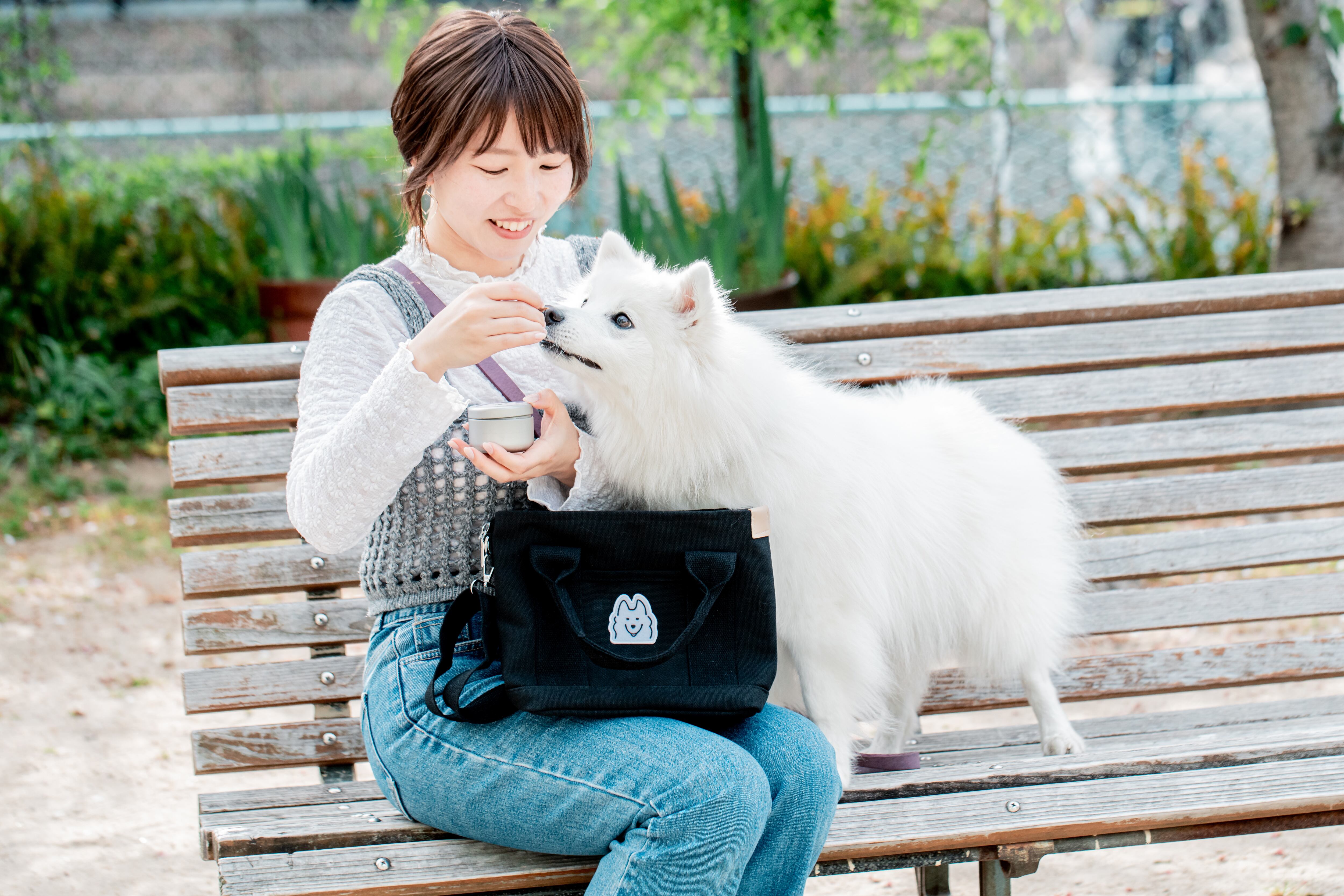 【しろくろふぁみりわん】お散歩バッグ:ブラック(日本スピッツ/キメ顔)