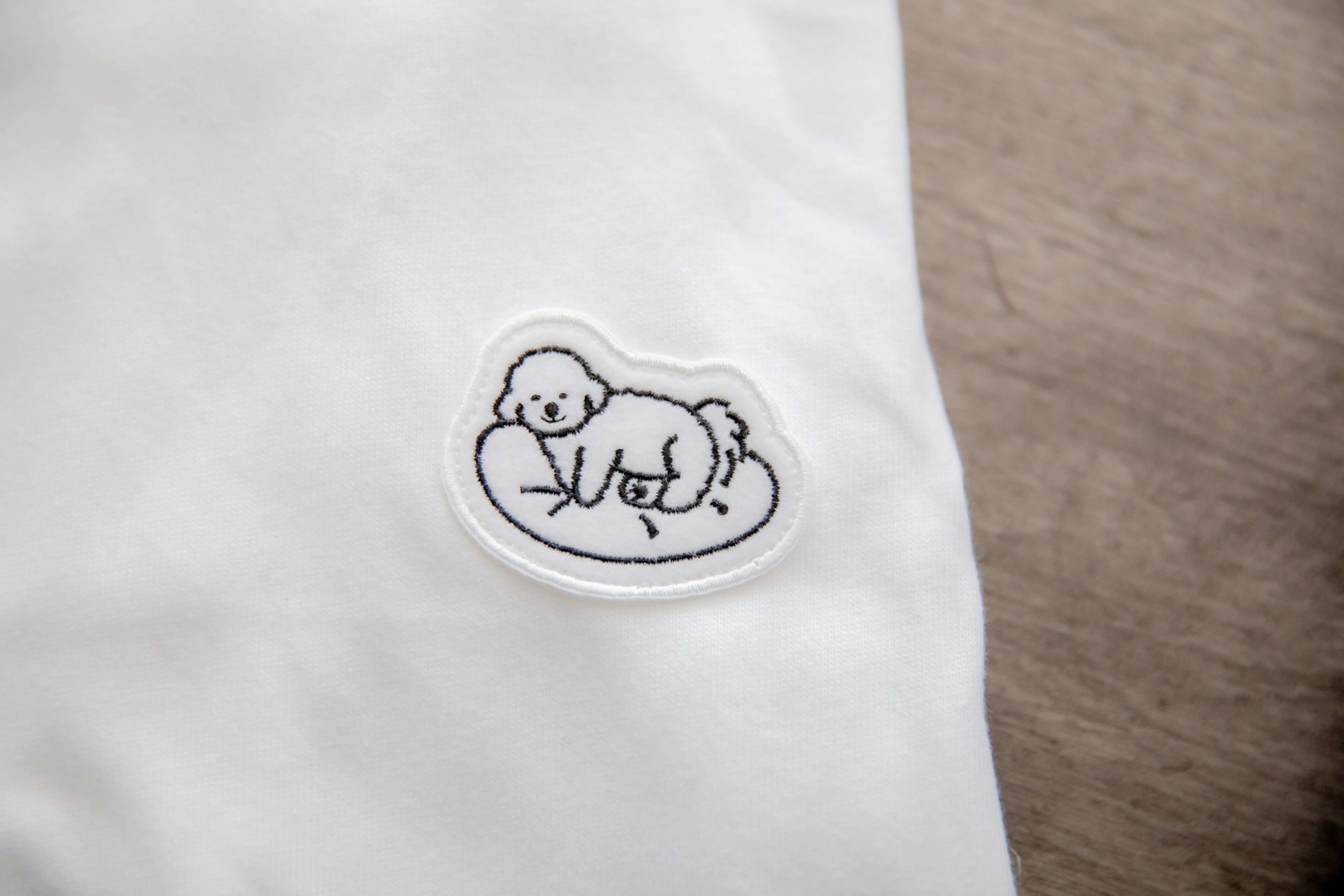 ふわふわで愛らしいわんちゃんの魅力を、白と黒の刺繍で大人かわいく表現しました。