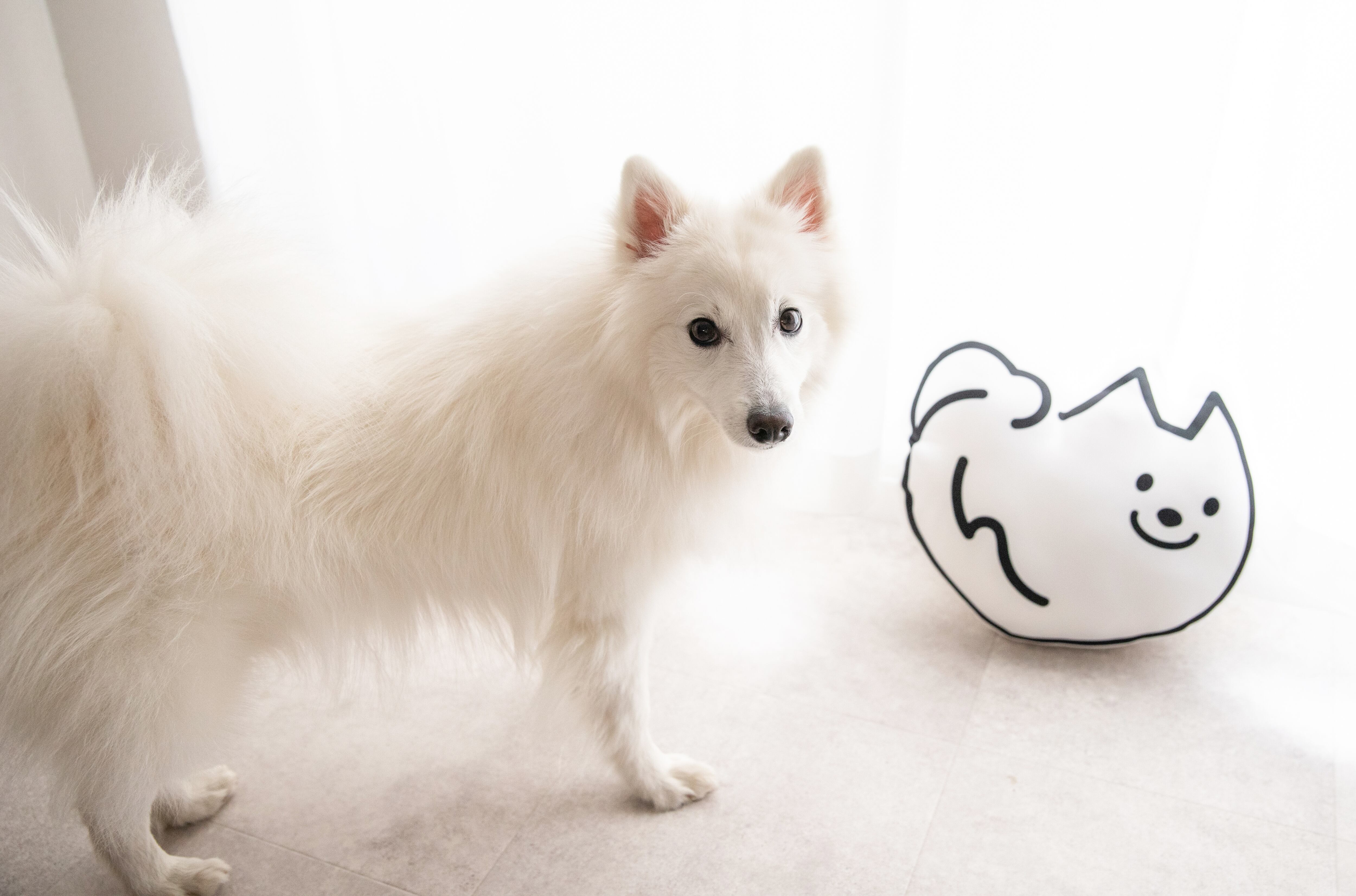 白と黒のシンプルな線で描かれた、日本スピッツらしい“まっしろふわふわ感”をそのまま形にした、癒し系アイテムです。